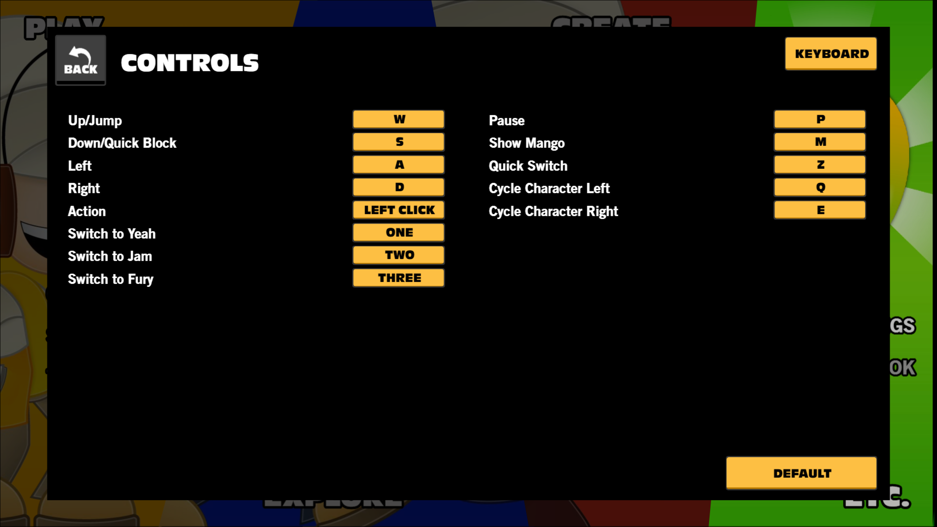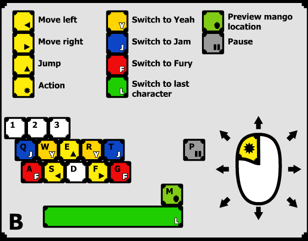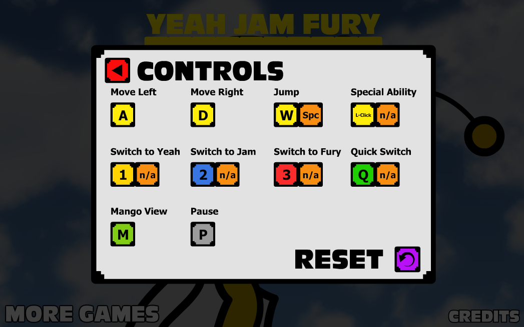 The controls option in Yeah Jam Fury is found in the settings menu. There are ten inputs the player can configure: two are assigned to movement, four are assigned to switching characters (three for specific characters and one for a "Quick Switch" to the previously selected character), and the other four are assigned to jumping, using the character's special ability, viewing the mango and pausing. Most of these controls can also be assigned a second alternative input (with the exception of the movement, mango, and pausing inputs, which can only be assigned one). Players can also reset any change done to the controls configuration to revert to the default configuration.