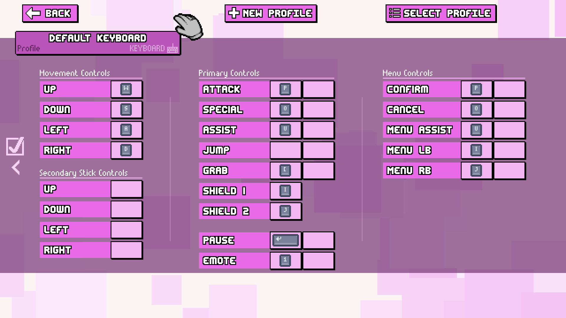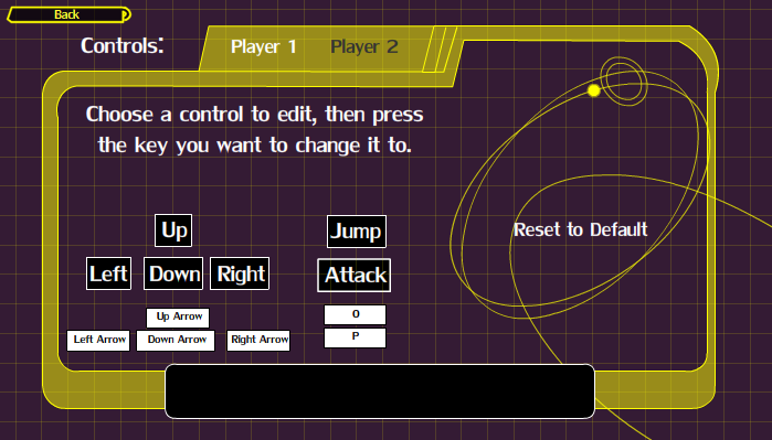 There are six inputs the player can configure: four are assigned to movement while the other two are assigned to attacking and jumping. Players can also reset any change done to the controls configuration to revert to the default configuration.