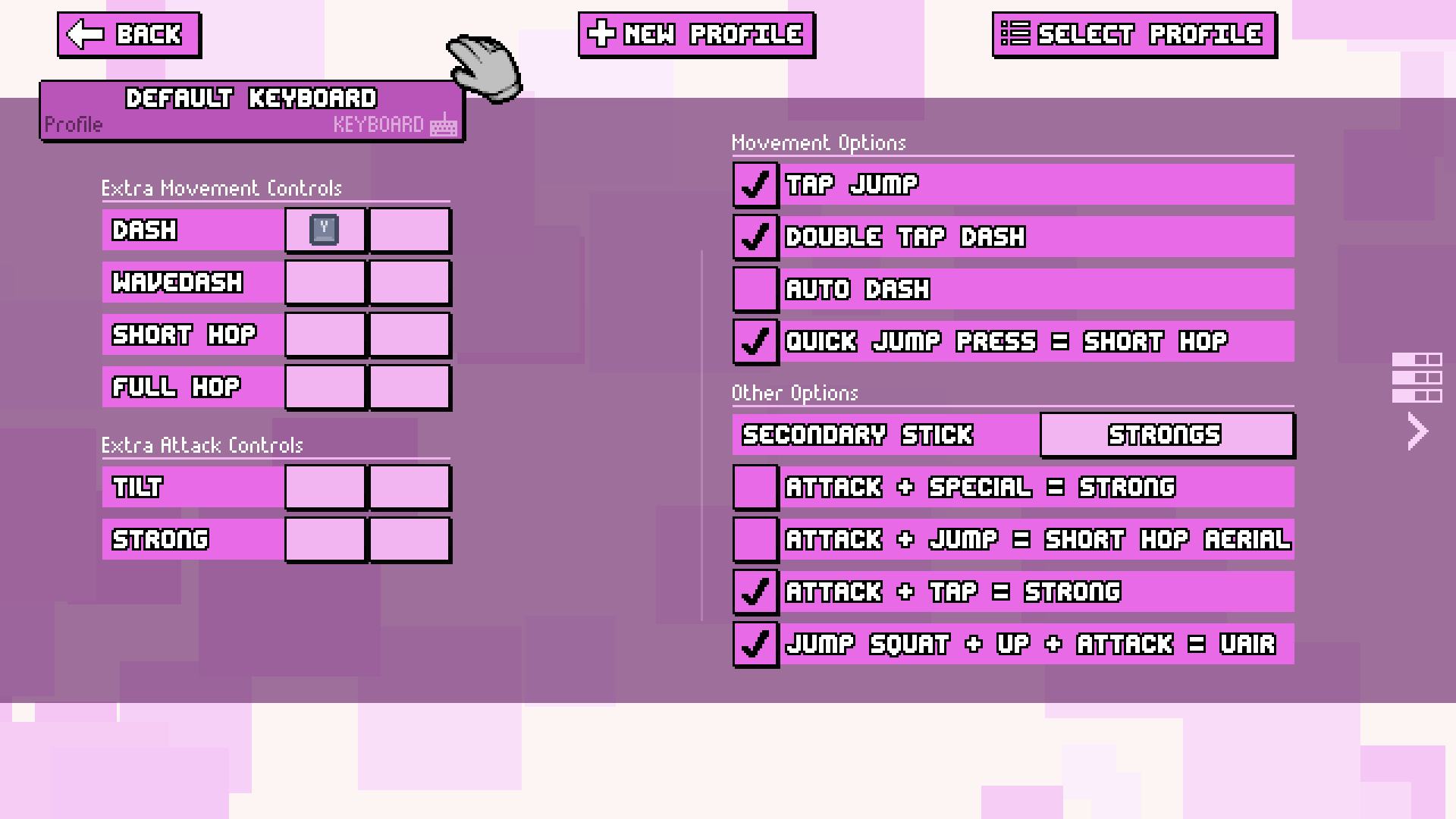 Along with these commands, players also have the additional functions of tap jump (which allows to jump with the assigned up key), auto-dash (which changes the optional dash button from to "walk"), and d-tap dash (double tap dashing). It should be noted that having the auto-dash function enabled means the player cannot select d-tap dash.