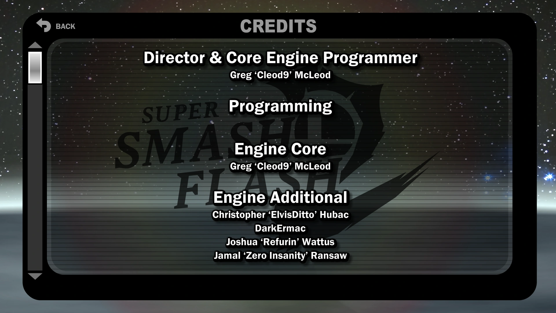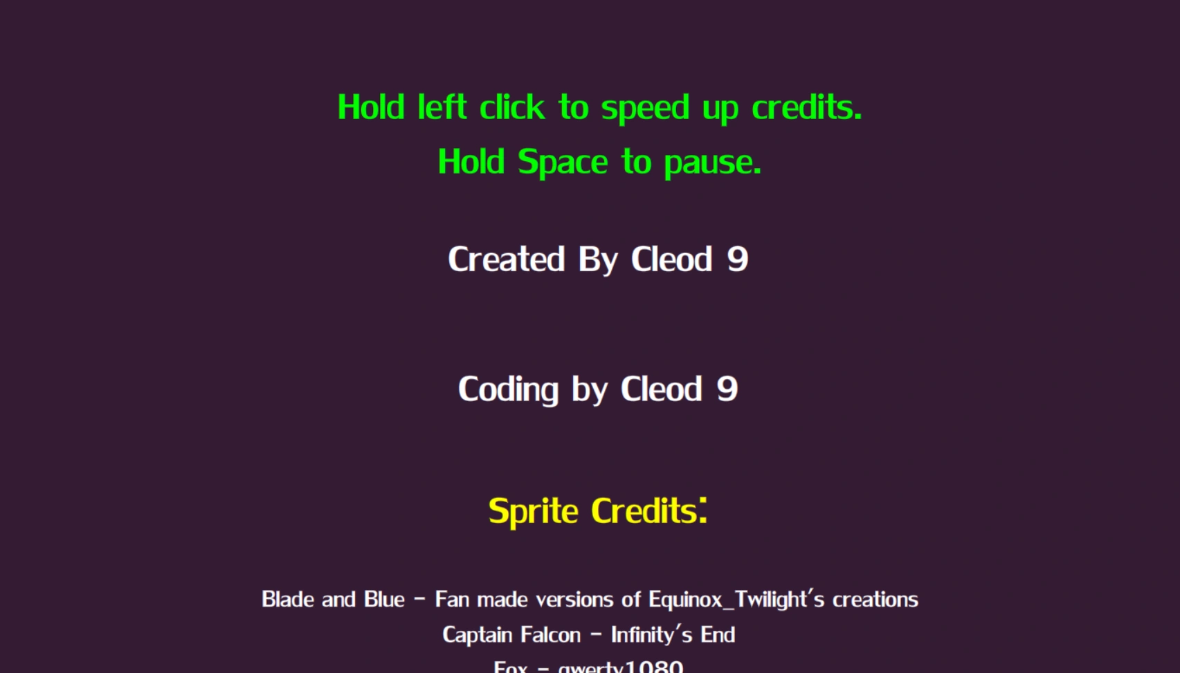 The full credits in Super Smash Flash can be accessed from the title screen, and they also appear after the congratulations screen from clearing Classic, Adventure, or All-Star. They appear against a purple background and scroll up from the bottom while the music track Final Destination plays. They list Cleod9 as the creator and programmer, the sources for all sprites and audio used, and the companies that own the franchises represented. Holding the left click inputs speeds up the scrolling, and holding the space bar pauses it.