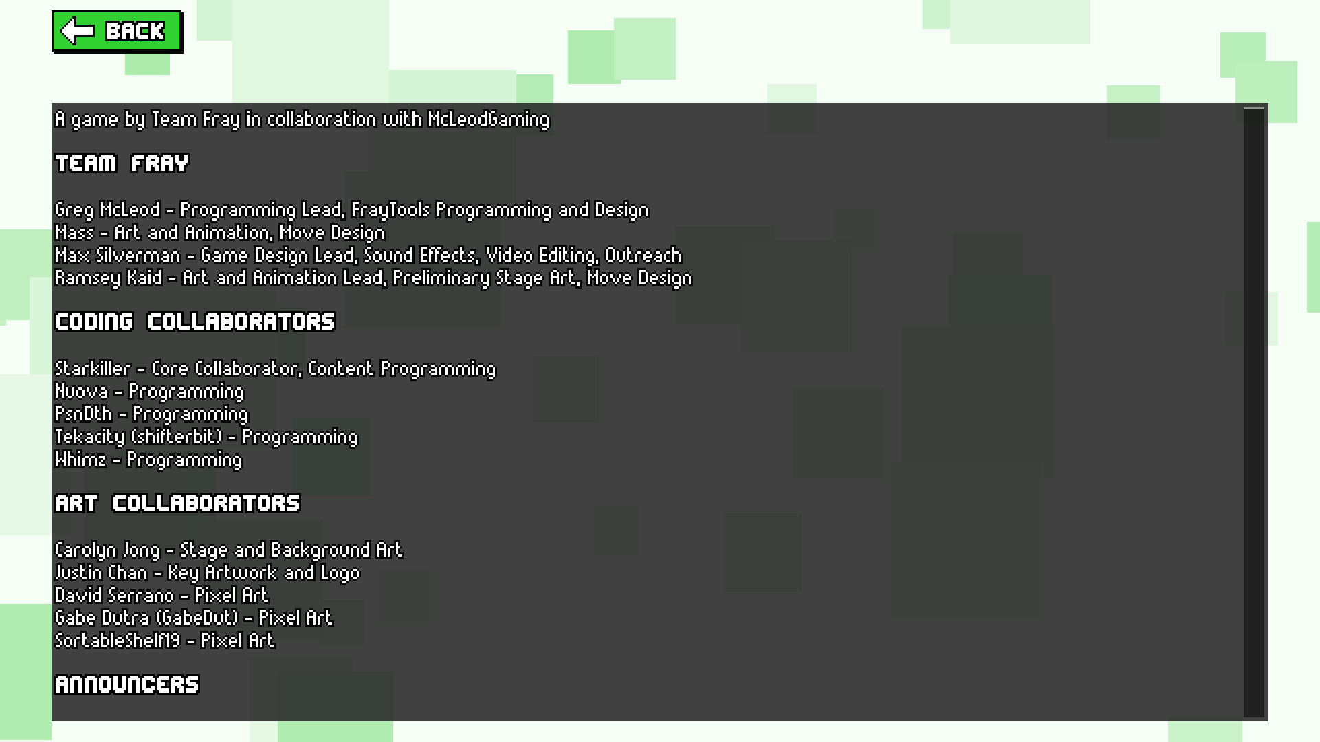 The credits in Fraymakers can be accessed in the Extras menu of the game. Like in SSF2, they appear in a box with a scrollbar to manually scroll through it. They list the members of Team Fray and their collaborators, including the companies who own the franchises represented. The game is also planned to include a "credits game" featuring the names of Kickstarter backers, with certain pledges having higher tiers, as well as cameos of custom characters from certain backers.