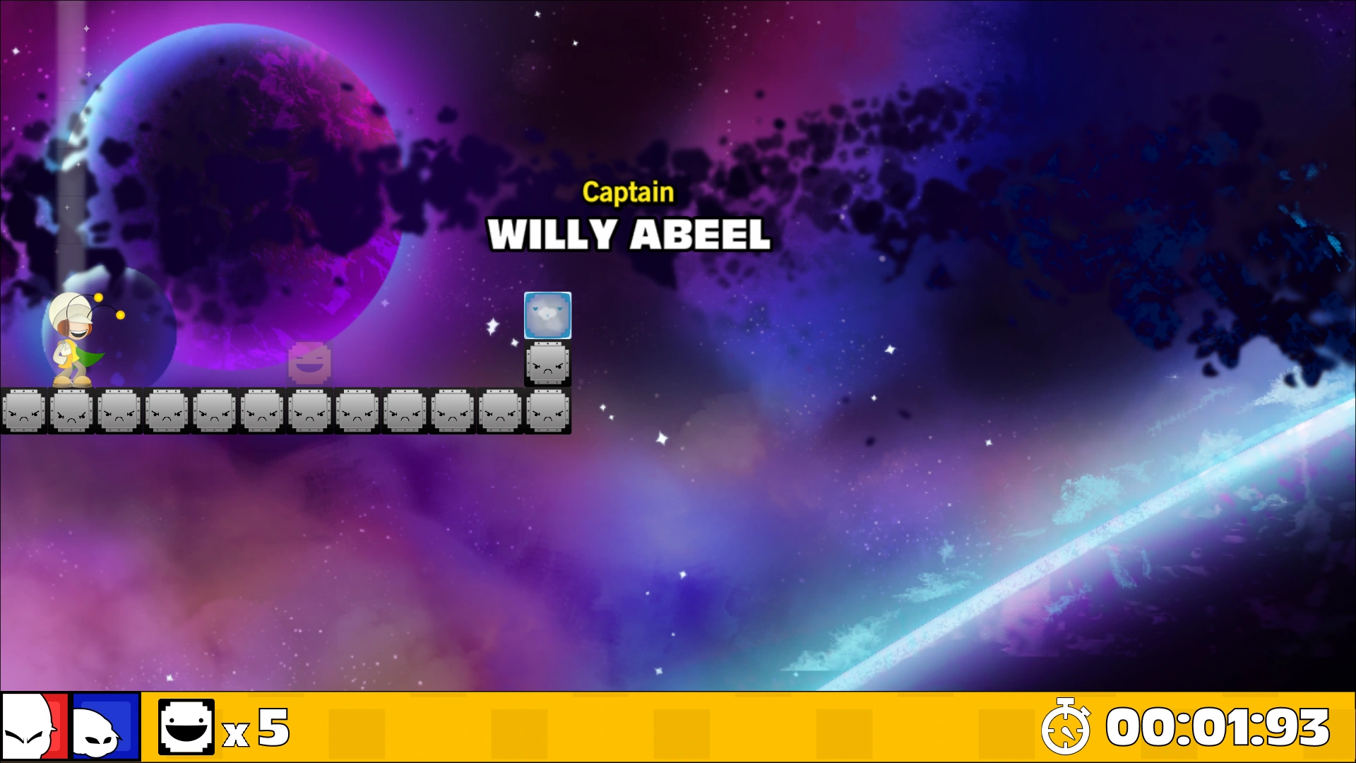 The credits in Yeah Jam Fury: U, Me, Everybody! take the form of an optional level appropriately named Credits. The level is played upon completing the one hundredth level of the game, Happy Birthday, and it can also be played by tickling the face on the title screen. The level is unique in that it takes place on a set of blocks that automatically progresses at all times, with new blocks being created and removed to the beat of the song that plays during the level, Best Day of My Life!. The staff gradually appears over the foreground of the level during its duration, and they also credit the publishing companies, the licensed music and assets used, and the development tools used to create the game.