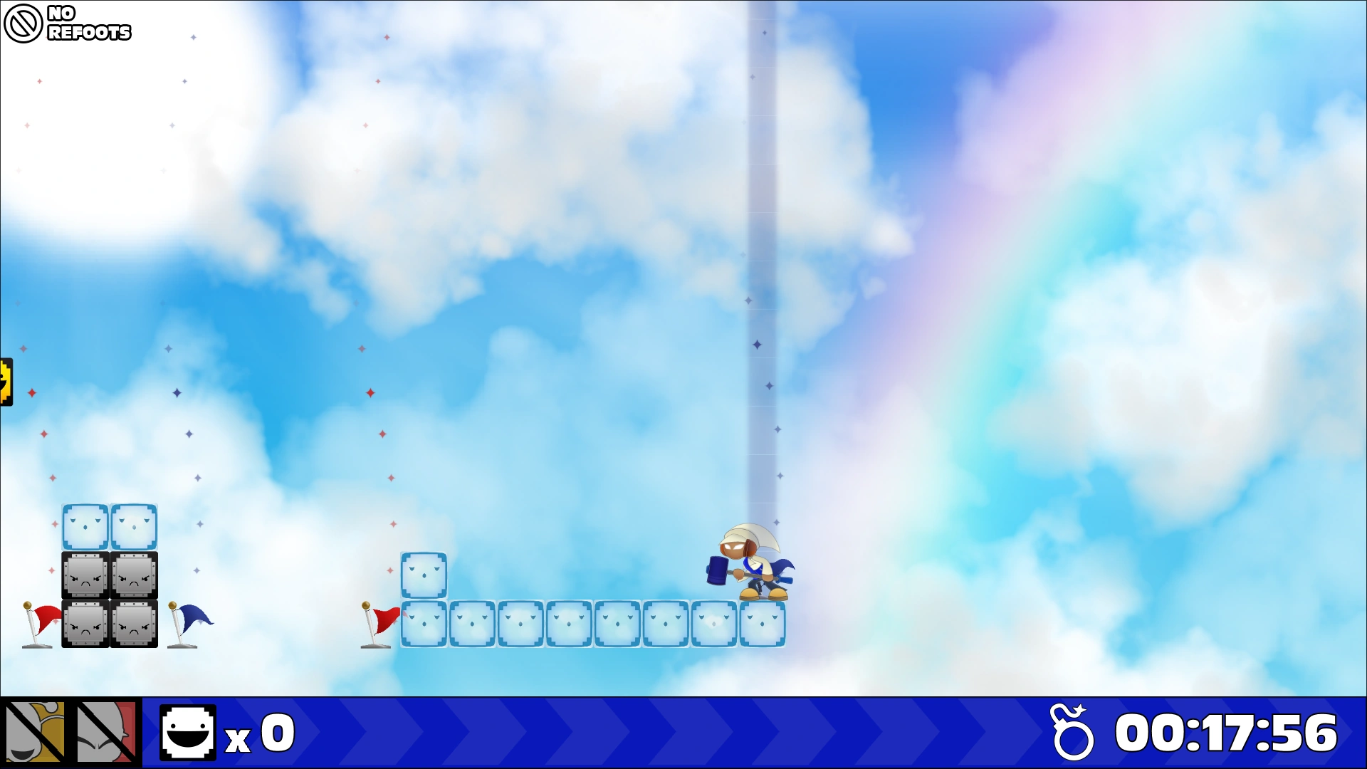 The B-Side version of this level shares a very similar layout, except not only is it flipped horizontally, but the Yeah-Only Flags are now replaced with Jam-Only Flags. Additionally, the first three platforms now have their topmost Steel Blocks replaced with Ice Blocks. There also is now a time limit of 20 seconds, and the level will restart if it is not completed in the time allotted. The player also can no longer refoot, and instead the level will restart if they fall. The player now must use Jam's boost to cross each gap and climb the leftmost platform.
