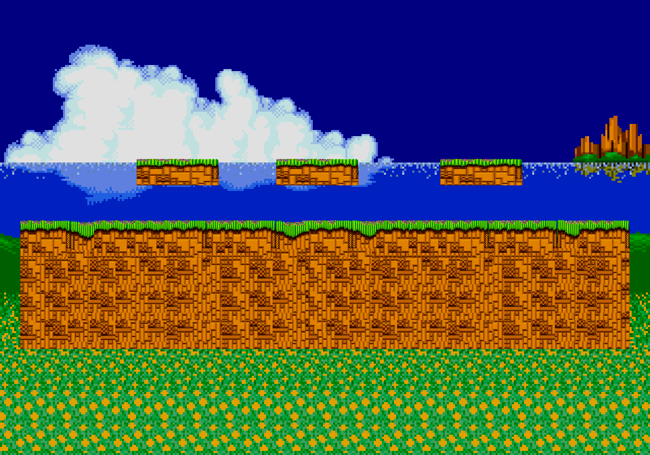 Emerald Hill Zone is a simple stage with a hard grassy platform as its main platform and three soft grassy platforms all at the same level (about a jump's length).