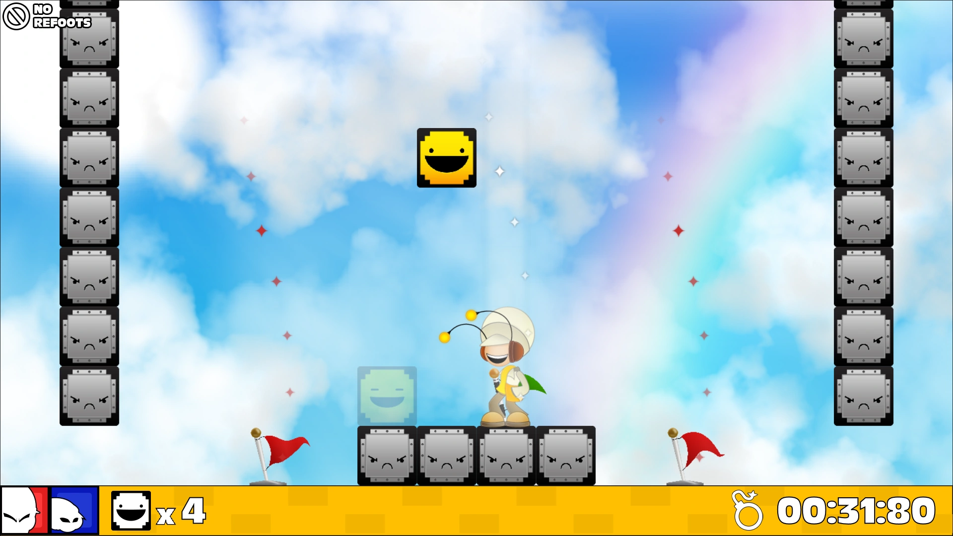 The B-Side version of this level shares a very similar layout, except not only is it flipped horizontally, but three Fury-Only Flags have been placed throughout the level, including one to the left of the starting platform, one to the right, and one in place of the rightmost Ice Block. Additionally, Yeah's quota now starts with four blocks and consists of Ice Blocks instead of Yellow Blocks. There also is now a time limit of 40 seconds, and the level will restart if it is not completed in the time allotted. The player also can no longer refoot, and instead the level will restart if they fall. To obtain the mango, the player must place reach the top of the walls without passing a Fury-Only Flag by placing an Ice Block above one of the bottom Fury-Only Flags. They then must place their remaining Ice Blocks to reach the mango by boosting from the highest one with Jam.