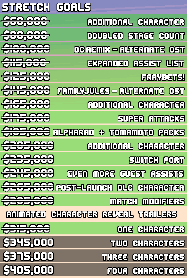 On September 10, 2020, the game was publicly announced under the codename McLeodGaming Next and scheduled to be formally revealed through Kickstarter during winter.[3] The official name was later revealed to be Fraymakers on October 13, 2020, with the Kickstarter date being changed to November of that year.[4] The game's Kickstarter campaign later launched on November 18, 2020 with a minimum funding goal of $46,000, which was reached within three hours of the campaign launching.[5] The campaign ended on December 17, 2020 after receiving a total of $364,922 and fulfilling most stretch goals.