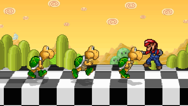 Two green Koopa Troopas appear in SSF2 as background characters on Mushroom Kingdom. Their designs are based on their in-game sprites from Super Mario Bros., except recolored. They walk back and forth on Mushroom Platforms, despite how green Koopa Troopas would normally fall off the edges of platforms.