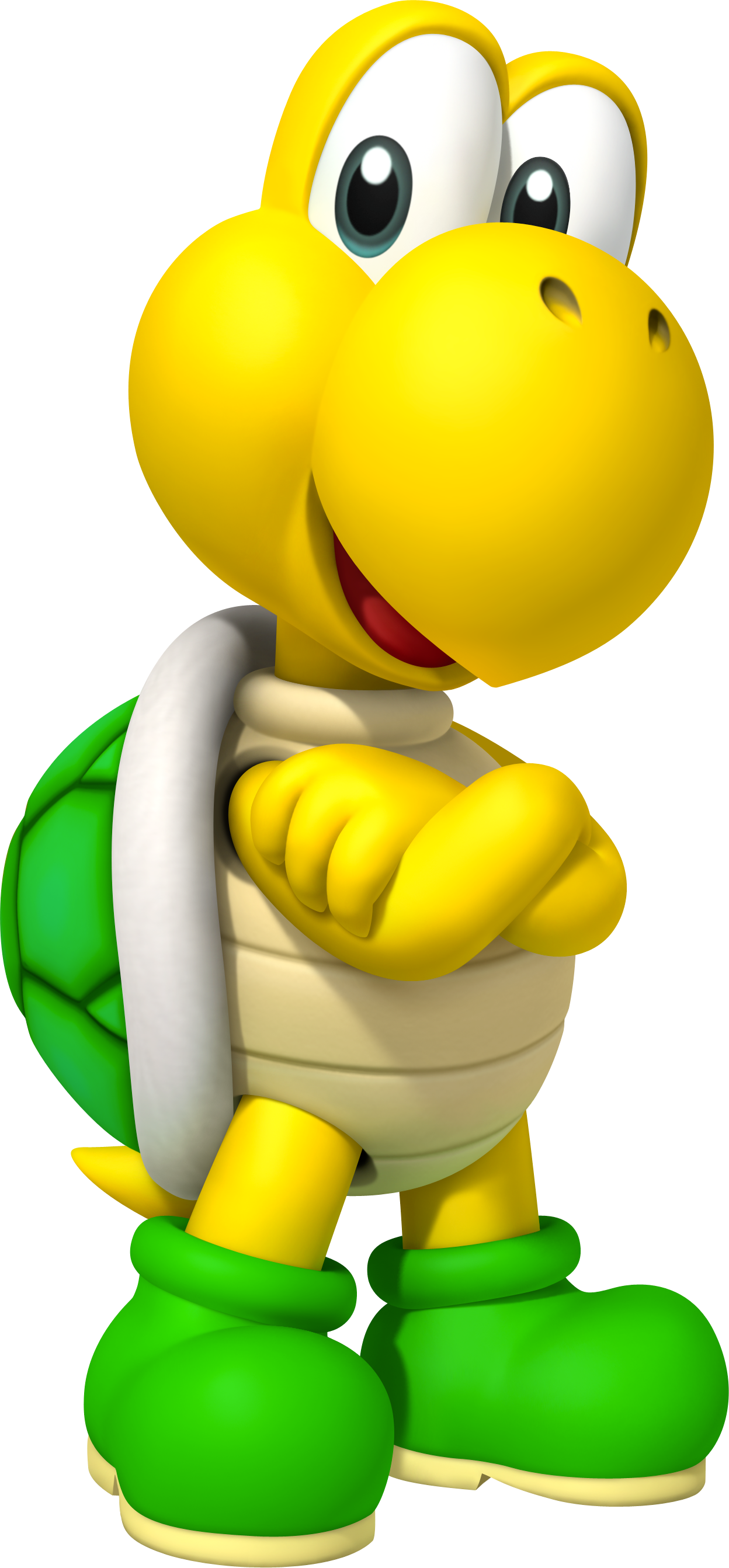 Koopa Troopas are turtle-like creatures and the namesake of the Koopa Troop, an army led by Bowser, himself a Koopa, in an attempt to conquer the Mushroom Kingdom. Having first appeared in Super Mario Bros., they have since become one of the most common enemies throughout the Mario series. They are notably one of the only types of enemies that Mario cannot normally defeat just by jumping on them, as doing so causes them to temporarily retreat into their shells for safety. However, once inside their shells, they can generally be picked up and thrown or kicked to slide across the ground and bounce off ground, defeating most other enemies in their paths. In games such as Super Mario World, jumping on them may also knock them out of their shells, leaving them fully vulnerable.