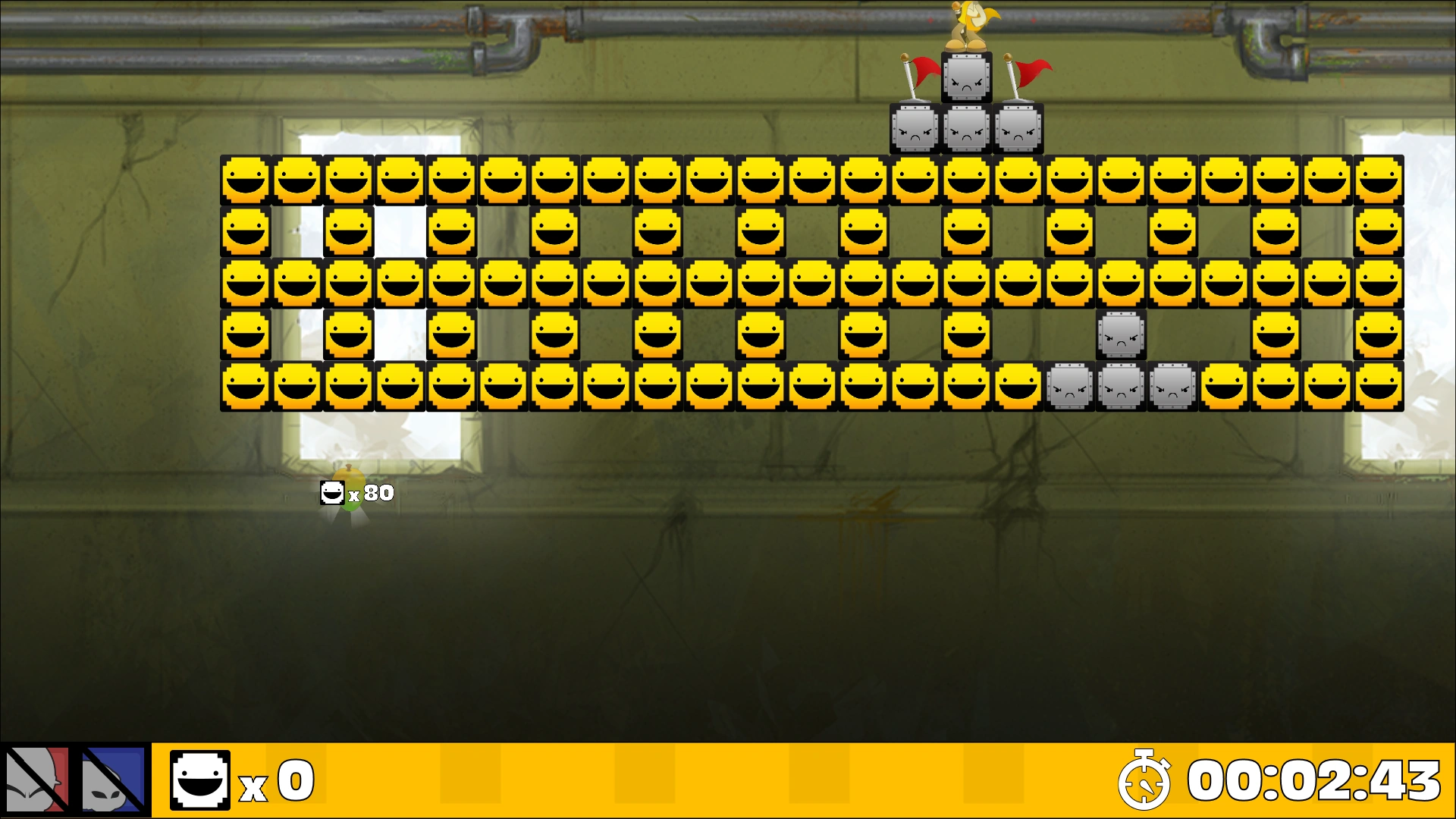 This level consists mainly of 88 Yellow Blocks arranged in five long rows with few open spaces in-between. There are two groups of four Steel Blocks, each arranged in an upside-down T shape, with one in the upper left portion of the Yellow Blocks and one in the lower left portion. The player starts at a Fury-Only Flag on the highest Steel Block, and the mango is located underneath the right side of the Yellow Blocks. To obtain it, the player must use Fury to fall to the lower set of Steel Blocks and then walk across the Yellow Blocks to the right, breaking any in their way. Upon reaching the right end of the level, the player may fall down the right end of the Yellow Blocks to fall through them and toward the mango to reach it.