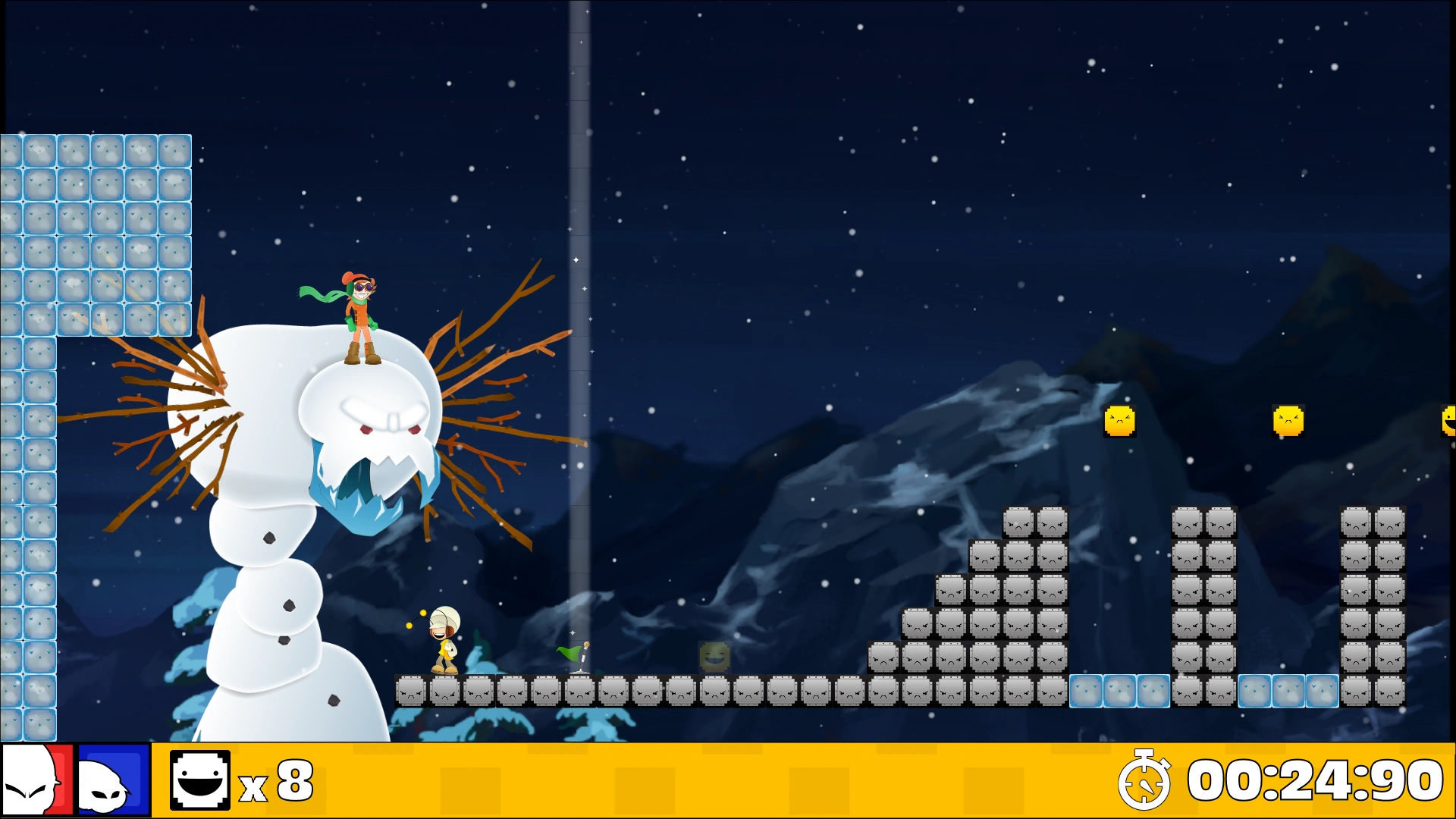 Mr. Snowman appears in Yeah Jam Fury: U, Me, Everybody! in the level Happy Birthday, where he rises from below when Ms. Carrot jumps onto him. He chases the player through the level, destroying any blocks in his path with his body as he advances, including the normally indestructible Steel Blocks. He can use his arms to shoot sticks that destroy singular blocks and knock the player back. He can also swing an arm forward to destroy a massive selection of blocks at once and launch the player farther. He can also roar, which destroys nearby Yellow Blocks. He disappears halfway into the level, only to reappear and continue chasing the player upwards.