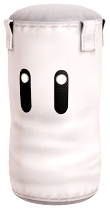 Sandbag is a white anthropomorphic bag with eyes whose sole role in the Super Smash Bros. series is to be attacked by other characters without fighting back. Its main appearance in the series is in the Home-Run Contest, a minigame where players are given 10 seconds to rack its damage up and hit it as far as possible using a Home-Run Bat. Sandbag has a visible damage percentage in this minigame, and it flies farther when hit at higher percentages, much like characters do. When hit off the starting platform, the camera follows Sandbag until it lands and stops moving, at which point Sandbag stands back up. According to its trophy descriptions in the series, Sandbag is not hurt by attacks, and it loves to see players wind up and let loose on it.