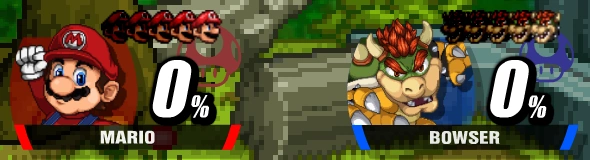 The amount of stocks players have in a match can be set to any whole number from 1 to 99, and each player shares the same amount of stocks at the beginning of a match. The amount of stocks remaining for each player is shown at the top of their respective damage meter, which disappears entirely when the player runs out of stocks. During a Team Battle in SSF2, a player with more than one remaining stock can share a stock with their defeated teammate if they press the pause input, allowing them to continue the match. This stock system can also be used in tandem with a time match, with the winner determined by the total amount of stocks remaining at the end of a match.