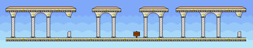 Temple is a long, solid platform that has four pass-through platforms. In the middle of the stage, there is a small sign post that characters can stand on.