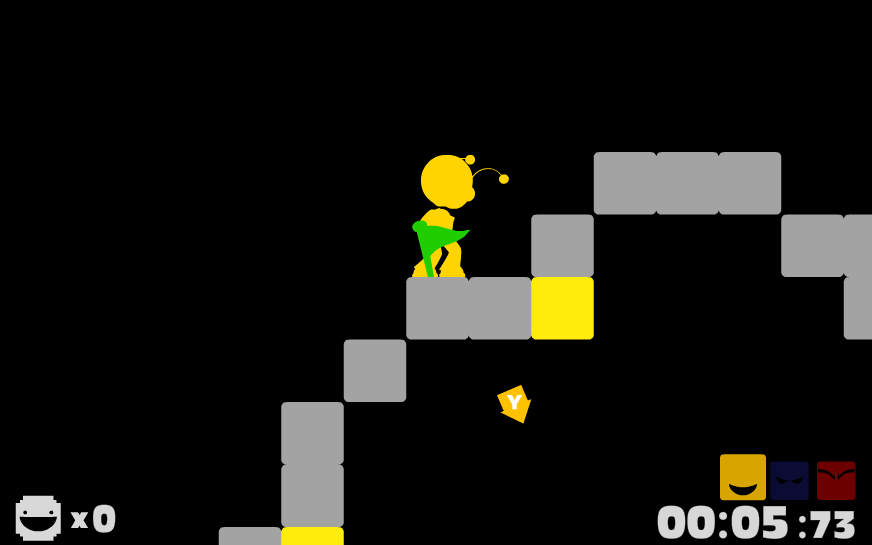 This level takes place on top of a large collection of Steel Blocks in the shape of a head with two eyes and a large mouth. There are several Yellow Blocks inside, two of which are on the right and can be destroyed with Fury from the outside. The player can access the inside of the head from the bottom, which they must use Yeah to reach by placing the blocks accordingly. The mango is located inside the mouth, and it can only be accessed by breaking the Yellow Blocks on the bottom of the mouth with Fury.